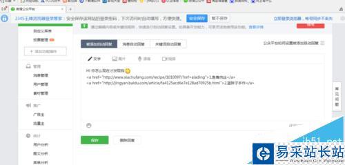 3、在自動回復里輸入代碼 <a href="鏈接地址">名稱</a>,然后下拉保存,如圖所示
