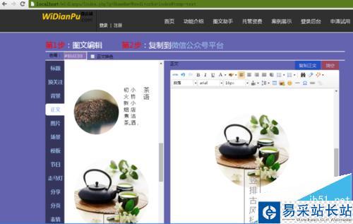 2、打開在線圖文編輯器 widianpu.com,圖文助手==>左邊選擇圖文類別==>點擊類別中的小項==>右邊是預覽效果==>點擊修改右邊的文字圖片視頻等
