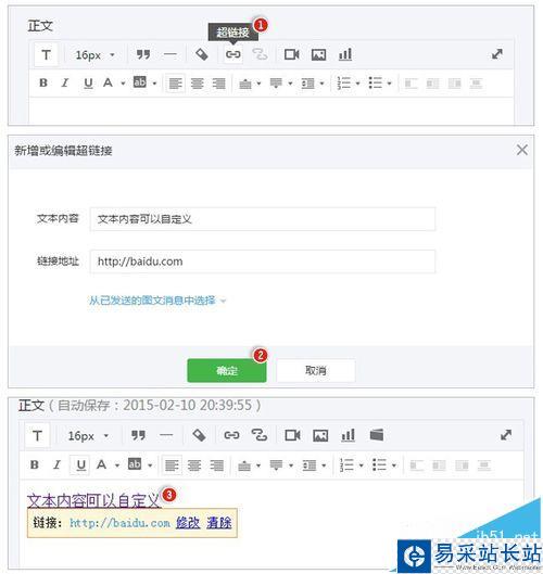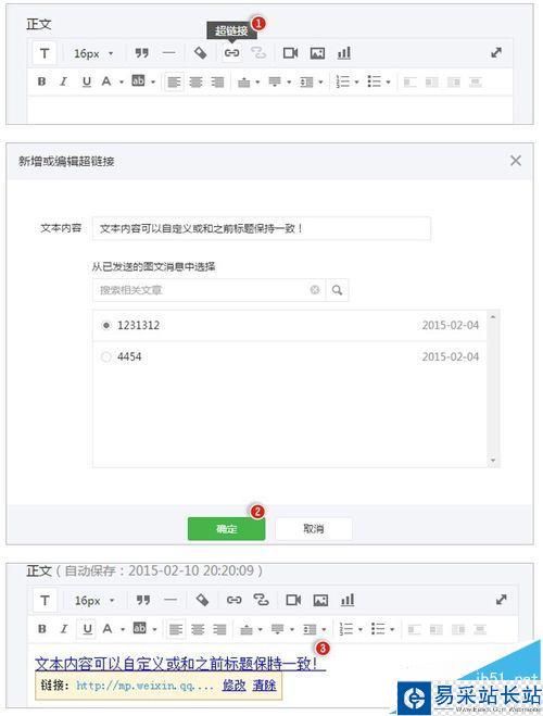 設(shè)置方法:進(jìn)入微信公眾平臺(tái)=》管理=》素材管理=》圖文消息=》單、多圖文消息=》點(diǎn)擊“超鏈接”圖標(biāo)=》輸入文本內(nèi)容、鏈接地址,及標(biāo)題即可。
