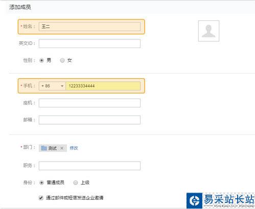 點擊“通訊錄”-“添加成員”,編輯成員的姓名、英文ID、職務、部門、性別、手機、座機、個人郵箱等信息,其中姓名、手機、部門是必填字段。