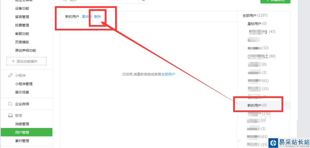 7、如果我們不需要這個標簽,想把這個標簽給刪了,選擇剛剛新建的標簽,然后找到新的用戶,重命名,和刪除,如圖所示,這里,我們點擊刪除,點擊確定按鈕,那么剛剛建好的標簽,就已經刪除了。