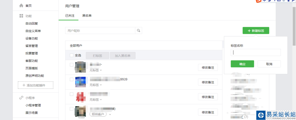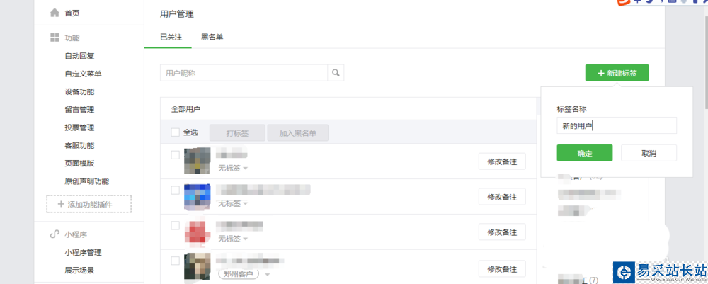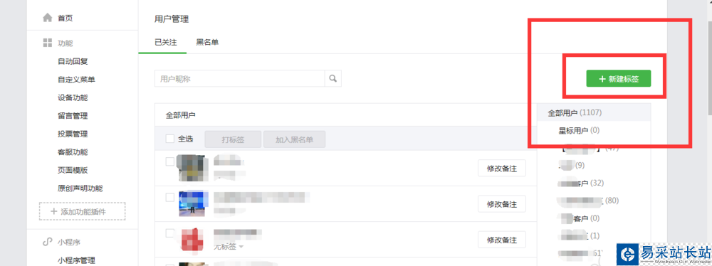 4、這頁我們能看到關注公眾號的用戶,用戶粉絲太多的話,如果想分類,可以新建標簽,標簽的位置如圖所示,