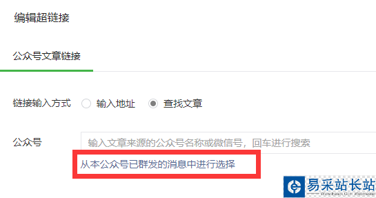 4、在編輯超鏈接界面,點擊查找文章,搜索自己想要的關(guān)鍵字,選擇“從本公眾號已群發(fā)的消息中進行選擇”。
