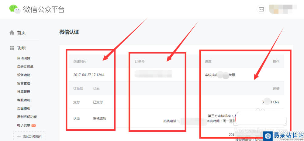 6、在這里可以查看詳細的訂單信息。什么時候申請的公眾號,費用多少等。都有顯示。