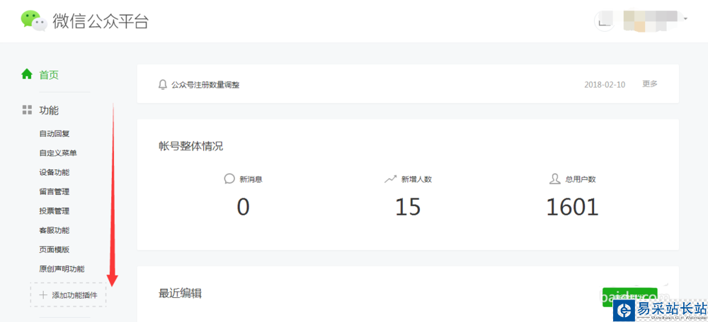 2、進入公眾平臺主頁,往下劃拉,選擇”+添加功能插件“進入下圖。