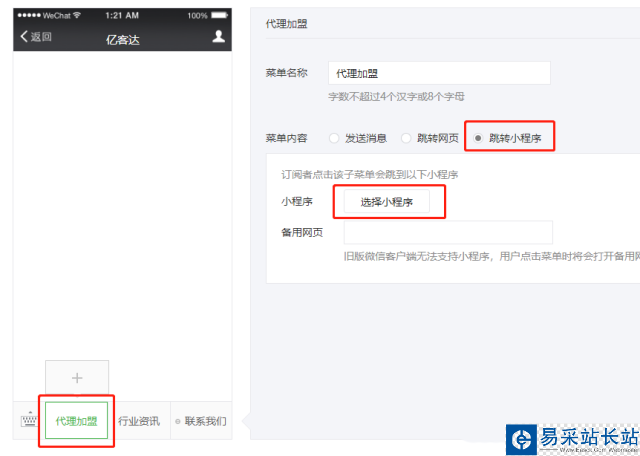 2、選擇自定義菜單,命名,選擇跳轉(zhuǎn)小程序,點(diǎn)擊選擇小程序;