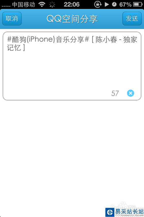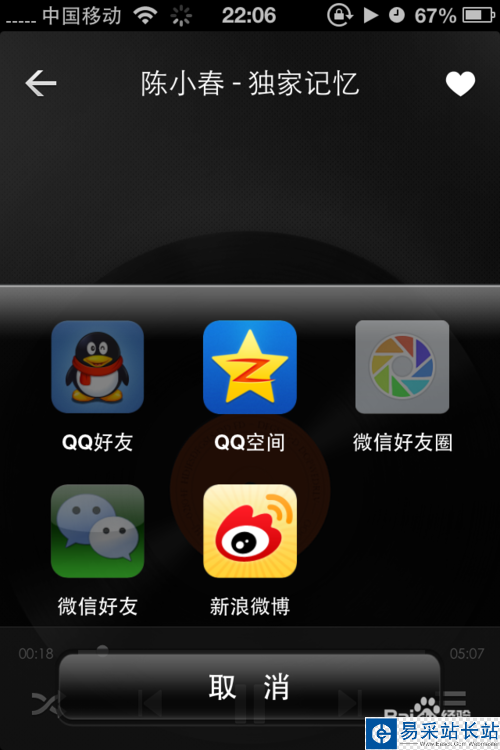 4、之后點擊空白處,就會彈出分享層,點擊分享按鈕,會彈出菜單,讓你選擇分享到哪里,目前舊版的酷狗音樂支持分享到 QQ QQ空間 微信 新浪微博 和朋友圈,但新版的好像屏蔽了分享的朋友圈的權限