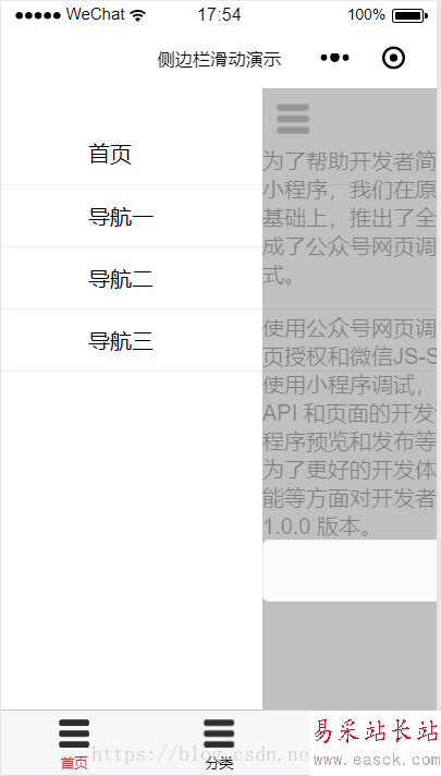3.然后,實(shí)現(xiàn)手指滑動(dòng)屏幕的時(shí)候,主頁(yè)的內(nèi)容,向左滑動(dòng)一定的寬度,讓側(cè)邊欄的內(nèi)容顯示出來(lái),而滑動(dòng)的效果是通過(guò) css 的 transition 來(lái)實(shí)現(xiàn)的。