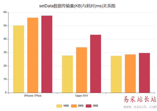 下圖是我們做的一組測(cè)試統(tǒng)計(jì):在相同網(wǎng)絡(luò)環(huán)境下,各個(gè)機(jī)型分別對(duì)大小為 1KB 、 2KB 、 3KB 的數(shù)據(jù)執(zhí)行 setData 操作所消耗的時(shí)間。