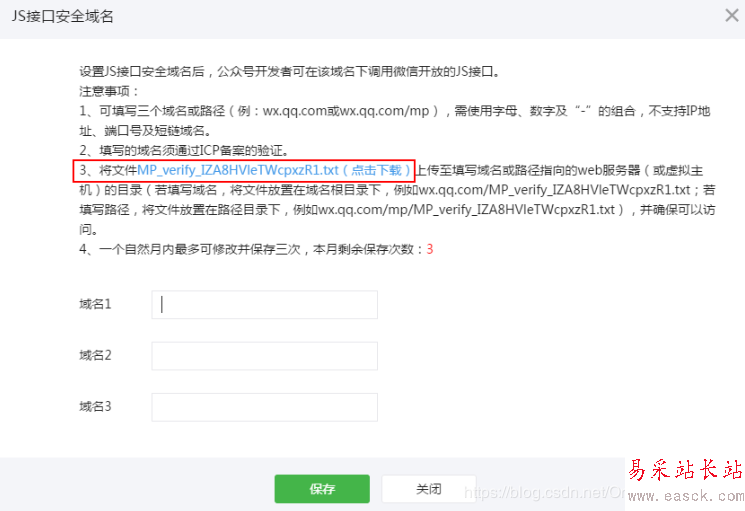 這需要使用微信的jssdk,先需要在微信公眾號后臺進行設置:公眾號設置-->功能設置-->JS接口安全域名。打開這個頁面之后你會看到下面的提示。需要先下載這個文件并上傳到指定域名的根目錄。