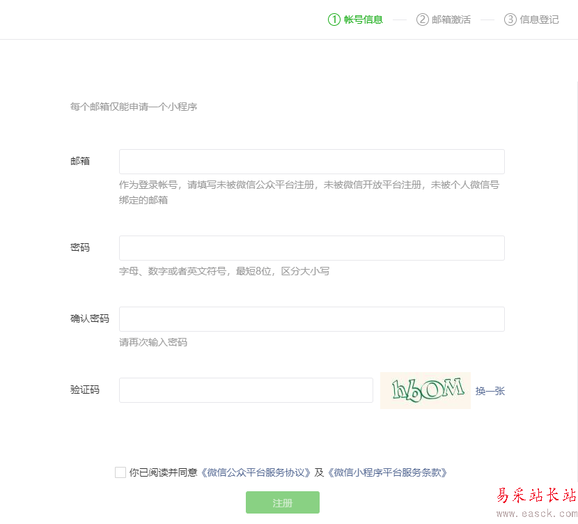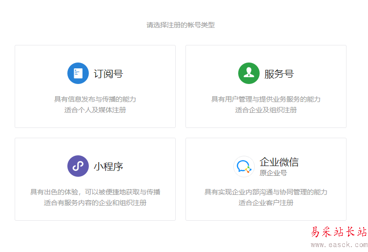 點(diǎn)擊傳送門立馬注冊(cè)微信小程序賬號(hào)。點(diǎn)進(jìn)去后會(huì)看到如下界面,選擇注冊(cè)類型時(shí)要選擇微信小程序。