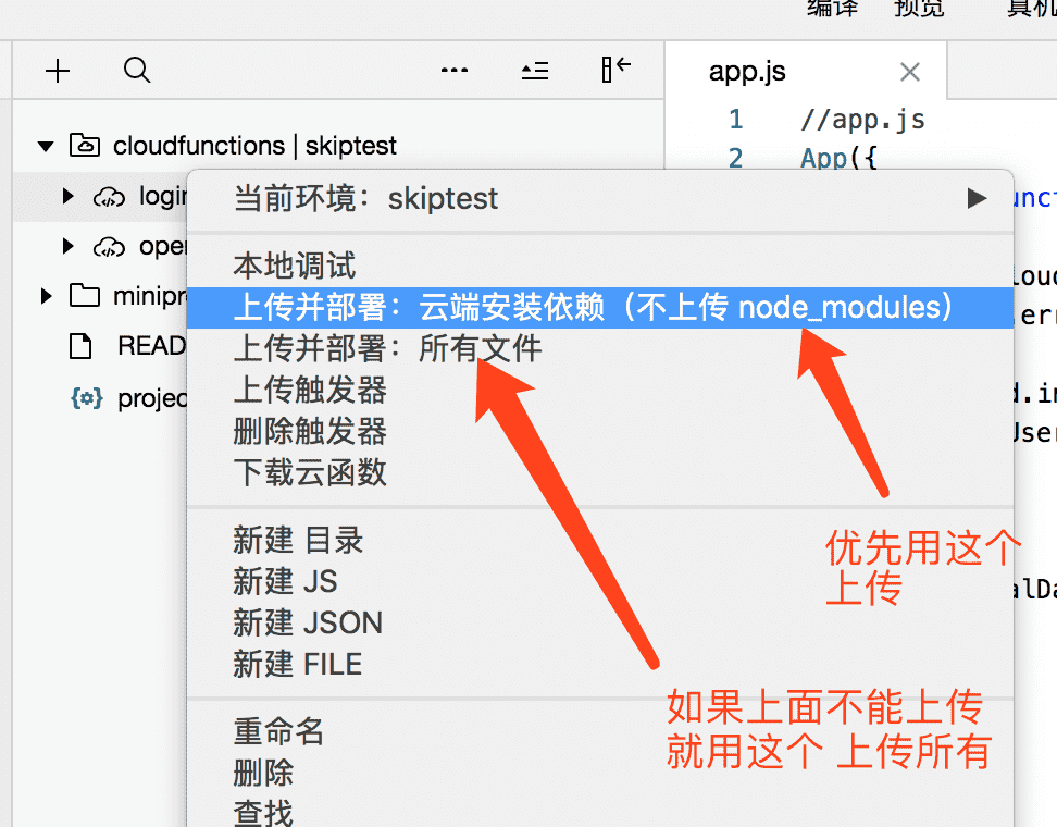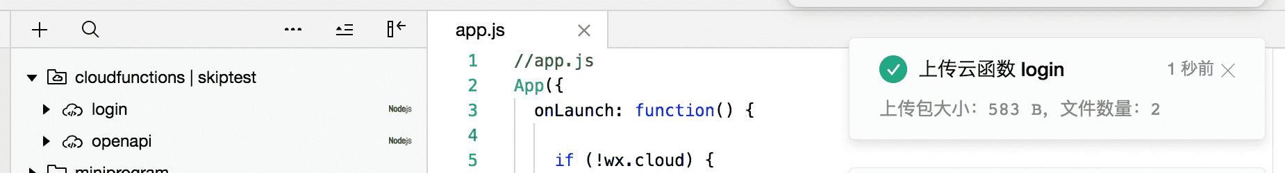 選中我們要部署的云函數(shù),右鍵,如上圖紅色框里所示。如果點(diǎn)一次不能上傳,就多點(diǎn)幾次,一直到出現(xiàn)下面提示框?yàn)橹?/p>