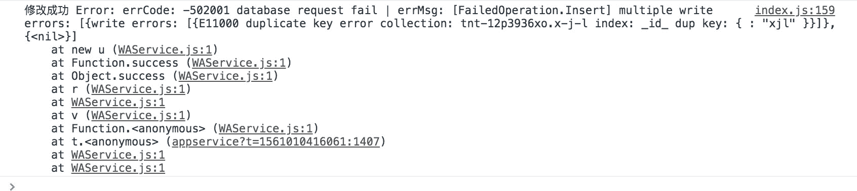 Error: errCode: -502001 database request fail | errMsg: [FailedOperation.Insert] multiple write errors: [{write errors: [{E11000 duplicate key error collection: tnt-12p3936xo.x-j-l index: id dup key: { : "xjl" }}]}, {<nil>}]詳細(xì)錯(cuò)誤如下圖: