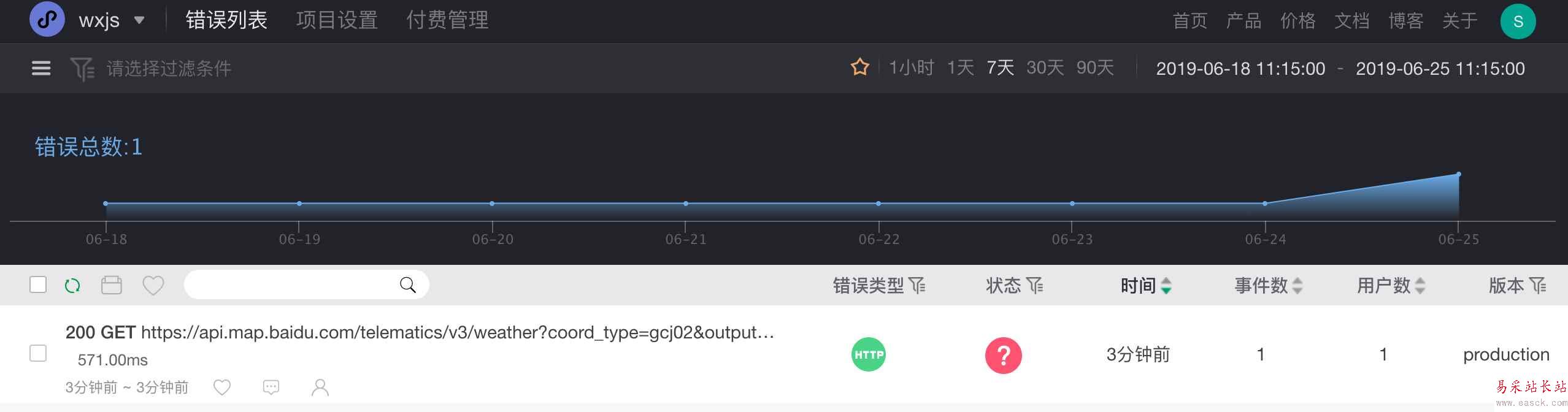 由于使用百度的 api,我們無法確認該接口的穩(wěn)定性,可能有時候會特別慢,導致天氣信息顯示不出來。于是,我們使用 Fundebug 來監(jiān)控請求過慢的情況。接下來,我們來演示如何監(jiān)控慢請求。注冊賬戶后,記得要在創(chuàng)建項目是選擇“微信小程序”這一項目類型。