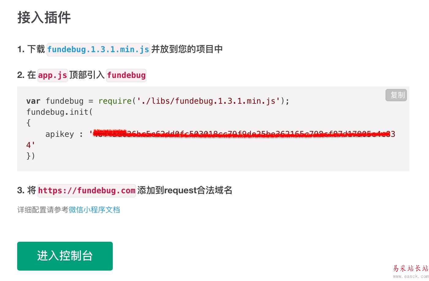 var fundebug = require("./utils/fundebug.1.3.1.min.js");fundebug.init({ apikey: "YOUR-API-KEY", monitorMethodCall: true, monitorMethodArguments: true, monitorHttpData: true, setSystemInfo: true, setUserInfo: true, setLocation: true, httpTimeout: 200});雖然init()函數(shù)只要設置apikey即可使用,但是為了最大程度發(fā)揮監(jiān)控的威力,我們不妨多設置一些監(jiān)控選項。