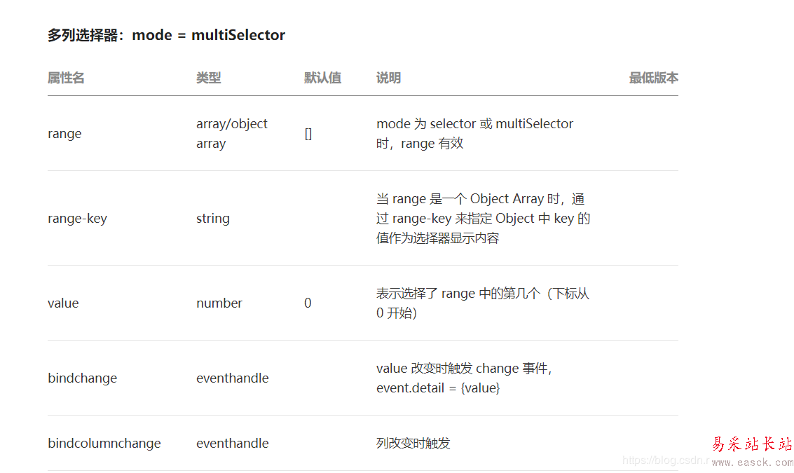 一個簡單地多列選擇器只要給picker組件加屬性mode="multiSelector"即可,綁定數(shù)據(jù)時使用range來綁定一個數(shù)組作為顯示內容,下面是官方給出的屬性解釋。