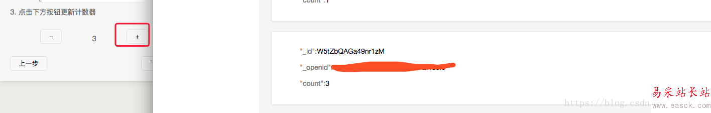 onCounterInc: function() { const db = wx.cloud.database() const newCount = this.data.count + 1 db.collection('users').doc(this.data.counterId).update({ data: { count: newCount }, success: res => { console.log(res); this.setData({ count: newCount }) }, fail: err => { icon: 'none', console.error('[數(shù)據(jù)庫] [更新記錄] 失?。?, err) } }) }, onCounterDec: function() { const db = wx.cloud.database() const newCount = this.data.count - 1 db.collection('users').doc(this.data.counterId).update({ data: { count: newCount }, success: res => { this.setData({ count: newCount }) }, fail: err => { icon: 'none', console.error('[數(shù)據(jù)庫] [更新記錄] 失?。?, err) } }) },