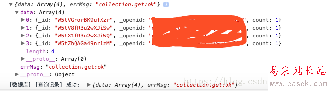 onQuery: function() { const db = wx.cloud.database() // 查詢當(dāng)前用戶所有的 counters db.collection('users').where({ _openid: this.data.openid }).get({ success: res => { console.log(res); this.setData({ queryResult: JSON.stringify(res.data, null, 2) }) console.log('[數(shù)據(jù)庫] [查詢記錄] 成功: ', res) }, fail: err => { wx.showToast({ icon: 'none', title: '查詢記錄失敗' }) console.error('[數(shù)據(jù)庫] [查詢記錄] 失?。?, err) } }) },