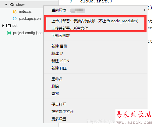右擊云函數然后出現下圖所示,然后我們點擊上傳部署:所有文件,如果上傳失敗那么我們店家上傳并部署:云端安裝依賴