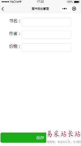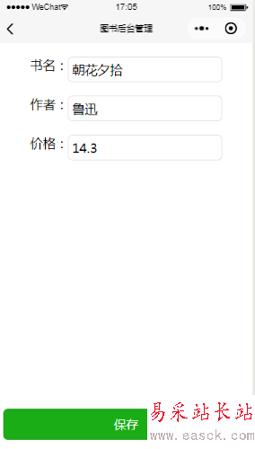 <!--pages/set/set.wxml--><view class='container'> <form bindsubmit='comfirm' > <view class='input-container'> <label>書名:</label> <input style='display:none' data-value='{{id}}' name="id" value='{{book._id}}'></input> <input data-value='{{name}}' name="name" value='{{book.name}}'></input> </view> <view class='input-container'> <label>作者:</label> <input data-value='{{author}}' name="author" value='{{book.author}}'></input> </view> <view class='input-container'> <label>價格:</label> <input data-value='{{price}}' name ="price" value='{{book.price}}'></input> </view> <view class='comfirm'> <button form-type='submit'>保存</button> </view> </form></view>