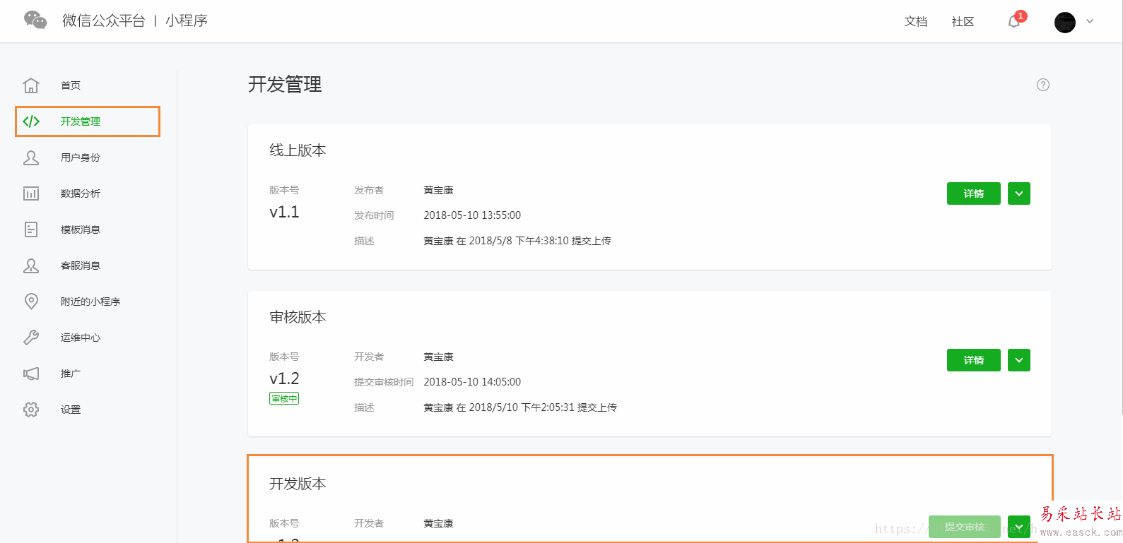 輸入相關版本號確定之后可以在微信小程序后臺管理處看到提交的版本。