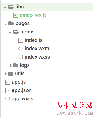 在創建的項目中,新建一個名為 libs 目錄,將 amap-wx.js (amap-wx.js 從下載的 zip 文件解壓后得到)文件拷貝到 libs 的本地目錄下,如下圖所示。
