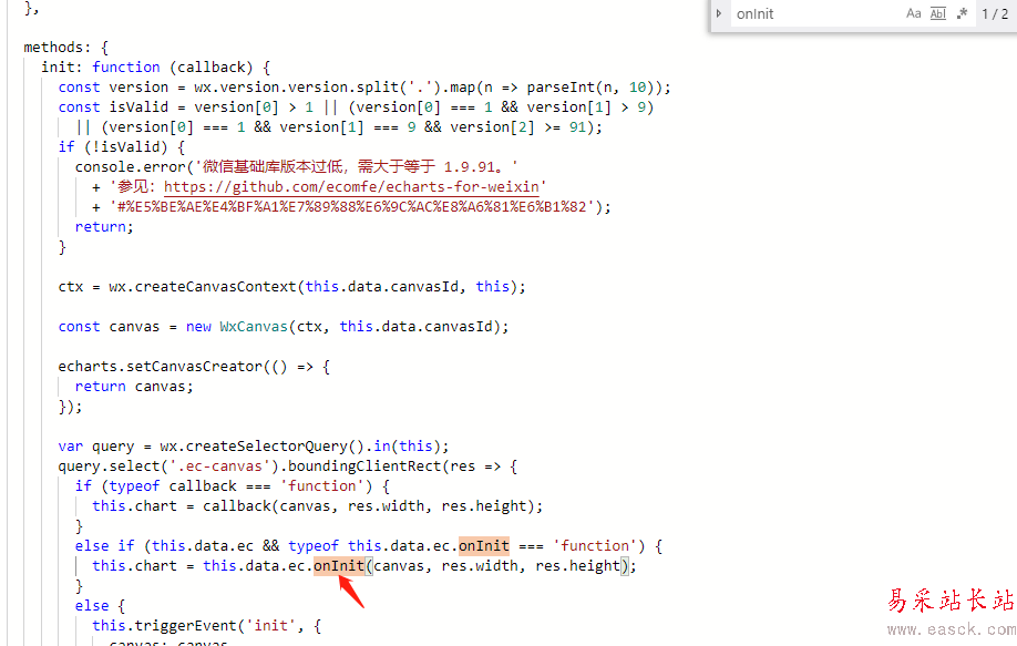 <ec-canvas id="mychart-dom-bar" canvas-id="mychart-bar" ec="{{ ec }}"></ec-canvas>因?yàn)閕nitChart函數(shù)賦值給了ec對(duì)象的onInit屬性,所以我們可以搜索一下onInit ,可以發(fā)現(xiàn)它在init函數(shù)里面,如圖:
