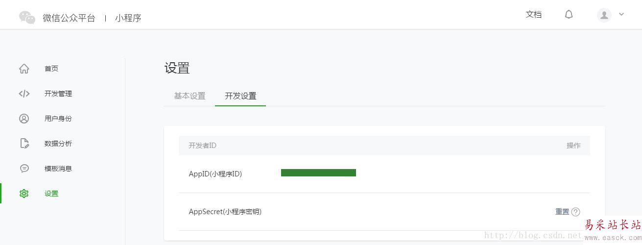 注:獲取accesstoken的方法跟微信公眾獲取accesstoken方法一致,不過小程序獲取accesstoken需要小程序的appid和appsercet。登錄 https://mp.weixin.qq.com ,就可以在網站的“設置”-“開發者設置”中,查看到微信小程序的 AppID 了,注意不可直接使用服務號或訂閱號的 AppID 。