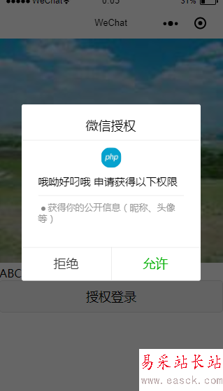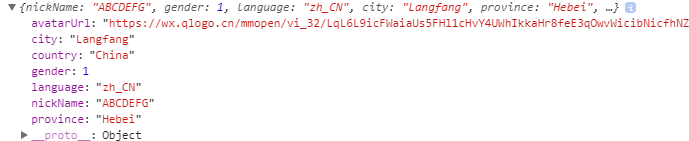 Page({ data: { //判斷getUserInfo是否在當前版本可用 canIUse: wx.canIUse('button.open-type.getUserInfo') }, bindGetUserInfo(e) { console.log(e.detail.userInfo) }})首次點擊button按鈕提示微信授權,允許后調用bindGetUserInfo函數打印獲得的用戶信息