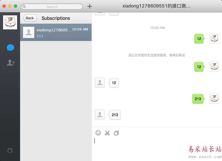 router.post('/', function (req, res) { res.writeHead(200, {'Content-Type': 'application/xml'}); var data = req.body.xml; var resMsg = '<xml>' + '<ToUserName><![CDATA[' + data.fromusername + ']]></ToUserName>' + '<FromUserName><![CDATA[' + data.tousername + ']]></FromUserName>' + '<CreateTime>' + parseInt(new Date().valueOf() / 1000) + '</CreateTime>' + '<MsgType><![CDATA[text]]></MsgType>' + '<Content><![CDATA['+data.content+']]></Content>' + '</xml>'; res.end(resMsg);});只需要將header的content-type設(shè)置為xml,返回一個xml的響應(yīng),那么公眾號就會相應(yīng)的回復(fù)一個消息,這里回復(fù)的消息是文本格式。(mac的微信一年沒更新了--)