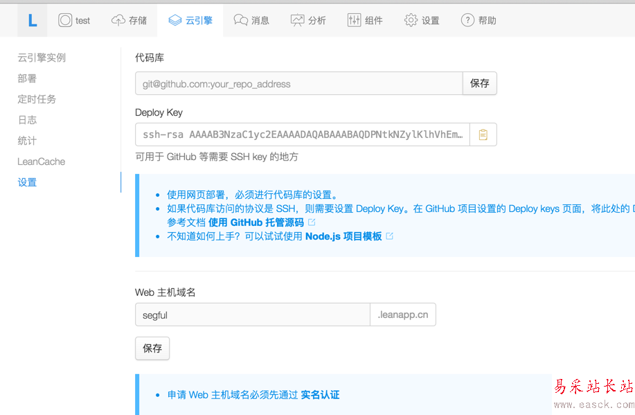 主要是云引擎這個選項,需要進入設(shè)置中配置好域名。