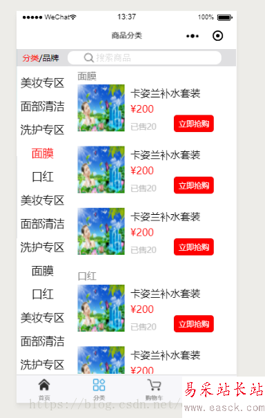// pages/class/class.jsPage({ /** * 頁面的初始數(shù)據(jù) */ data: { classfiySelect: "", leftText: [{ id: "01", text1: "美妝專區(qū)", }, { id: "02", text1: "面部清潔", }, { id: "03", text1: "洗護專區(qū)", }, { id: "04", text1: "面膜", }, { id: "05", text1: "口紅", }, { id: "06", text1: "美妝專區(qū)", }, { id: "07", text1: "面部清潔", }, { id: "08", text1: "洗護專區(qū)", }, { id: "09", text1: "面膜", }, { id: "010", text1: "口紅", }, { id: "011", text1: "美妝專區(qū)", }, { id: "012", text1: "面部清潔", }, { id: "013", text1: "洗護專區(qū)", }, { id: "014", text1: "面膜", }, { id: "015", text1: "口紅", }, { text1: "美妝專區(qū)", }, { text1: "面部清潔", }, { text1: "洗護專區(qū)", }, { text1: "面膜", }, { text1: "口紅", }, ], rightData: [{ id: "01", title: "美妝專區(qū)", frist: [{ url: "/images/85309.jpg", text: "卡姿蘭補水套裝", money: 200, sum: 20, id:1, }, { url: "/images/85309.jpg", text: "卡姿蘭補水套裝", money: 200, sum: 20, id: 2, }, { url: "/images/85309.jpg", text: "卡姿蘭補水套裝", money: 200, sum: 20, }, ], }, { id: "02", title: "面部清潔", frist: [{ url: "/images/85309.jpg", text: "卡姿蘭補水套裝", money: 200, sum: 20, }, { url: "/images/85309.jpg", text: "卡姿蘭補水套裝", money: 200, sum: 20, }, { url: "/images/85309.jpg", text: "卡姿蘭補水套裝", money: 200, sum: 20, }, ], }, { id: "03", title: "洗護專區(qū)", frist: [{ url: "/images/85309.jpg", text: "卡姿蘭補水套裝", money: 200, sum: 20, }, { url: "/images/85309.jpg", text: "卡姿蘭補水套裝", money: 200, sum: 20, }, { url: "/images/85309.jpg", text: "卡姿蘭補水套裝", money: 200, sum: 20, }, ], }, { id: "04", title: "面膜", frist: [{ url: "/images/85309.jpg", text: "卡姿蘭補水套裝", money: 200, sum: 20, }, { url: "/images/85309.jpg", text: "卡姿蘭補水套裝", money: 200, sum: 20, }, { url: "/images/85309.jpg", text: "卡姿蘭補水套裝", money: 200, sum: 20, }, ], }, { id: "05", title: "口紅", frist: [{ url: "/images/85309.jpg", text: "卡姿蘭補水套裝", money: 200, sum: 20, }, { url: "/images/85309.jpg", text: "卡姿蘭補水套裝", money: 200, sum: 20, }, { url: "/images/85309.jpg", text: "卡姿蘭補水套裝", money: 200, sum: 20, }, ], }, { id: "06", title: "美妝專區(qū)", frist: [{ url: "/images/85309.jpg", text: "卡姿蘭補水套裝", money: 200, sum: 20, }, { url: "/images/85309.jpg", text: "卡姿蘭補水套裝", money: 200, sum: 20, }, { url: "/images/85309.jpg", text: "卡姿蘭補水套裝", money: 200, sum: 20, }, ], }, ], }, /** * 生命周期函數(shù)--監(jiān)聽頁面加載 */ onLoad: function(options) { this.setData({ classfiySelect: this.data.leftText[0].id }) }, /** * 生命周期函數(shù)--監(jiān)聽頁面初次渲染完成 */ onReady: function() { }, /** * 生命周期函數(shù)--監(jiān)聽頁面顯示 */ onShow: function() { }, /** * 生命周期函數(shù)--監(jiān)聽頁面隱藏 */ onHide: function() { }, /** * 生命周期函數(shù)--監(jiān)聽頁面卸載 */ onUnload: function() { }, /** * 頁面相關事件處理函數(shù)--監(jiān)聽用戶下拉動作 */ onPullDownRefresh: function() { }, /** * 頁面上拉觸底事件的處理函數(shù) */ onReachBottom: function() { }, /** * 用戶點擊右上角分享 */ onShareAppMessage: function() { }, //滾動觸發(fā) scroll: function(e) { var scrollTop = e.detail.scrollTop, h = 0, classfiySelect; var that = this; that.data.leftText.forEach(function(clssfiy, i) { var _h =26 + that.length(clssfiy['id'])*102; if (scrollTop >= h){ classfiySelect = clssfiy['id']; } h +=_h; console.log(h); }) that.setData({ classfiySelect: classfiySelect, }) }, //求每一欄高度 length: function(e) { var that = this; var rightData = that.data.rightData; for (var i = 0; i < rightData.length; i++) { if(rightData[i]['id']==e){ return rightData[i]['frist'].length; } } }, //點擊左邊事件 left_list: function(e) { var that = this; var l_id = e.currentTarget.dataset.id; that.setData({ rigId: l_id, }) }, //跳轉(zhuǎn)詳情界面 particulars:function(e){ }})