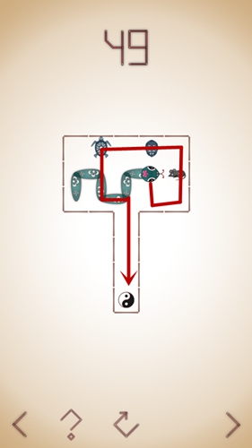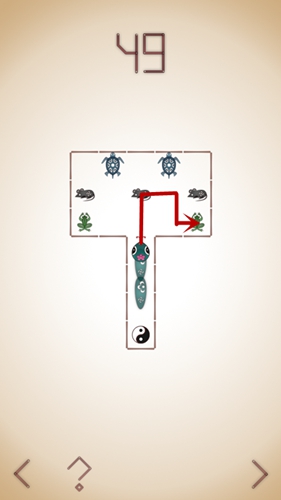 這關(guān)先去觸碰右邊的青蛙,注意不要吃掉青蛙上面的老鼠;然后吃掉左邊青蛙上方的老鼠,觸碰左邊青蛙;最后吃掉老鼠和烏龜,觸碰太極圖即可~