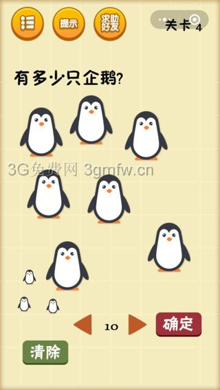 答案:10(注意有些企鵝下面還藏著企鵝,重點是左下角的清除按鈕移走下面還有三只)