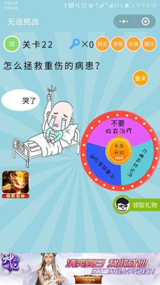 答案:將不要哭了中的“不要”兩個(gè)字移到轉(zhuǎn)盤中的放棄治療選項(xiàng)里面,再點(diǎn)擊開始