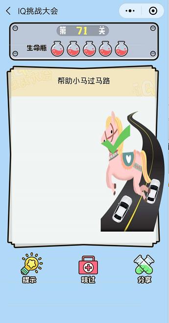 微信IQ挑戰大會第71關【幫助小馬過馬路】答案攻略