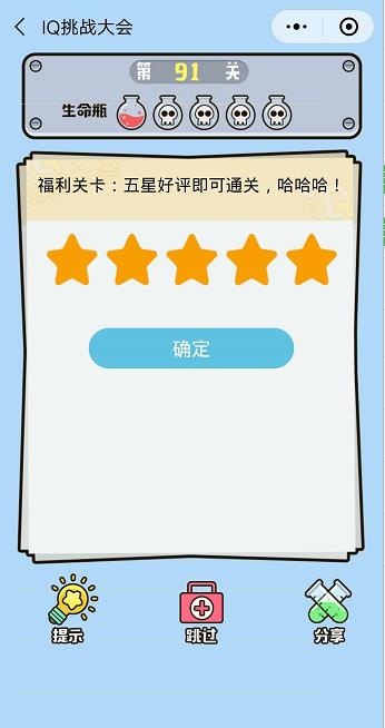 微信IQ挑戰大會第91關【福利關卡五星好評即可通關哈哈哈】答案攻略