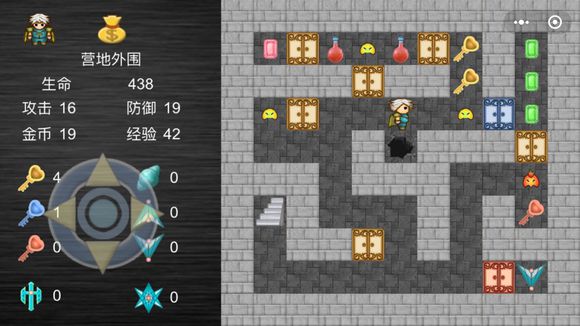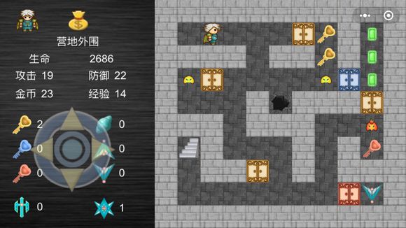 進入營地外圍,先殺黑頭拿藍寶石,并打通右邊暗墻,打通黃門右側暗墻,披荊斬棘并打通剩余兩個暗墻,得一把藍鑰匙,上樓加防御