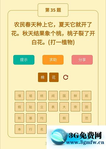 第三十五關,農民春天種上它,夏天它就開了花。秋天結果像個桃,桃子裂了開白花。(打一植物)