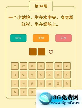 第三十四關,一個小姑娘,生在水中央,身穿粉紅衫,坐在綠船上。