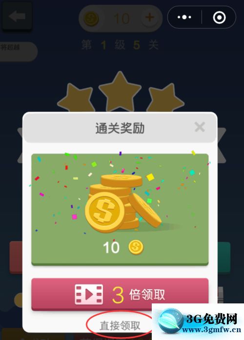 連續(xù)通過5關(guān)之后,會(huì)有“通關(guān)獎(jiǎng)勵(lì)”,點(diǎn)擊“直接領(lǐng)取”就可以獲得了游戲金幣。