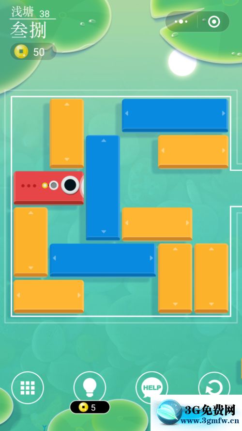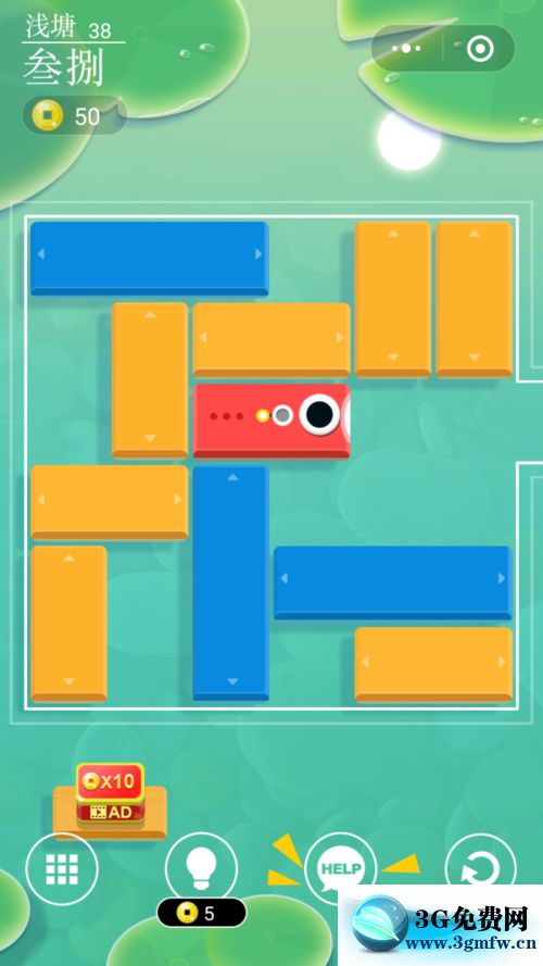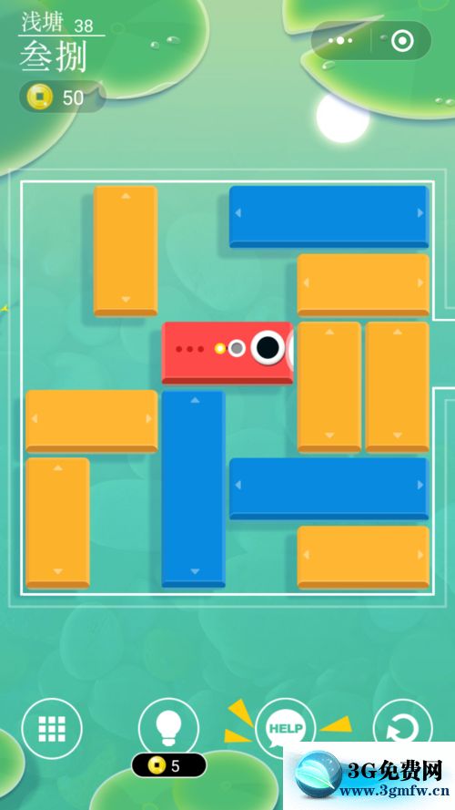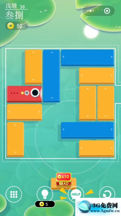 進入微信小游戲淺塘38級開始,游戲界面如下圖,顯然開始要移動最前(右)邊的豎黃色塊下移,然后將其左緊鄰的橫藍、黃色塊向前(右)移動。