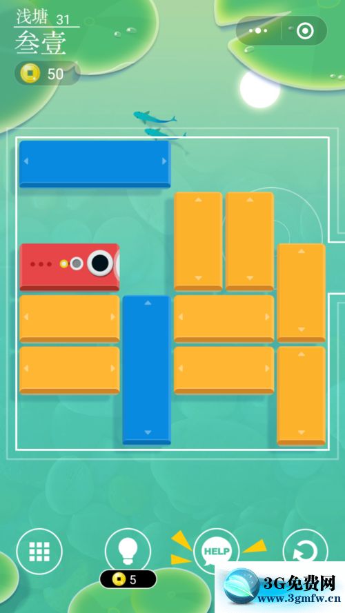 微信小游戲淺塘31級開始如下圖1所示,顯然,要先將前面所有豎黃塊向下移動,成為如下圖2所示。然后,再將上圖2中最上面的橫藍色長條塊向前(右)移動,豎藍色長條塊向上移動成下圖1,接著移動中間橫黃色塊向左,再將其下面的豎黃色塊上移,最后移動成下圖2所示。然后,將上圖2中最上面的橫藍色長條塊向后(左)移動成下圖1,最后再將紅魚前面的三個豎黃塊向上移動即可過關。