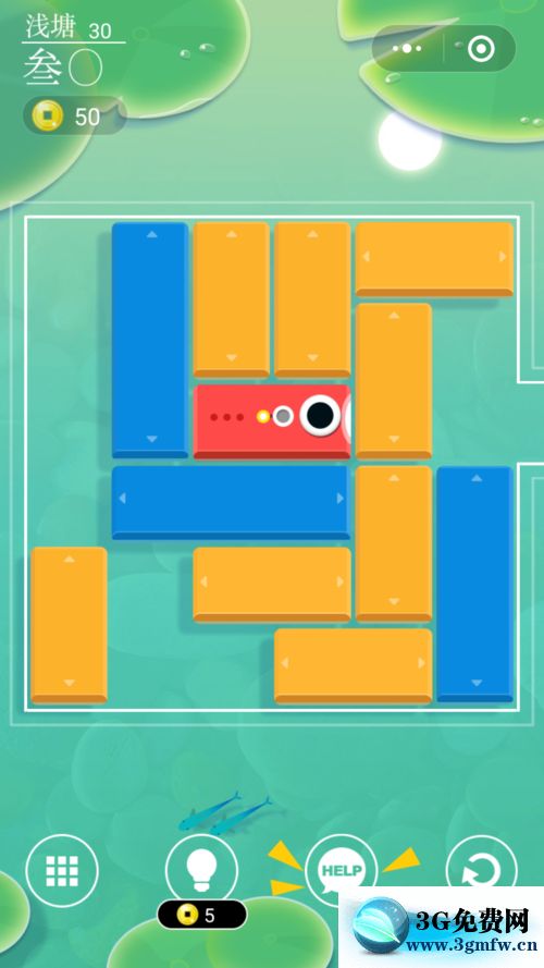 30級淺塘游戲開始的局面如下圖,要想讓紅色魚塊穿過池塘,則必須先移動最前端(右端)的藍色長條塊才行。如下圖1~2.