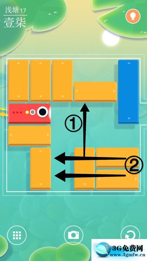 先將圖中所選①號(hào)橙色方塊向上移動(dòng),再將②號(hào)兩個(gè)橙色方塊向左移動(dòng)。