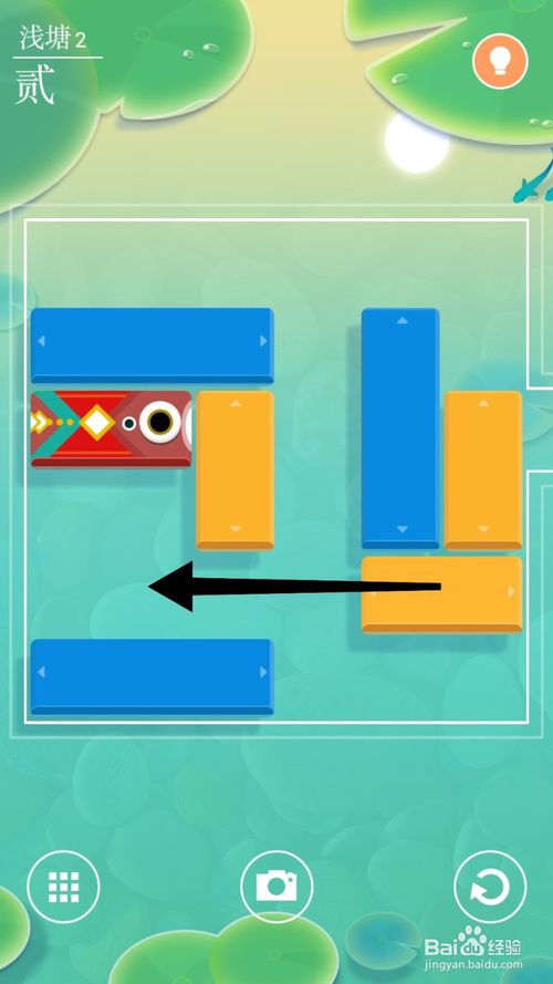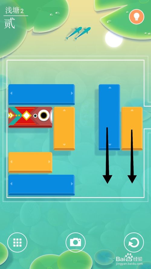 將“小魚”向左移動(dòng),為其他方塊的挪動(dòng)騰出空間。將圖中所選橙色方塊向上移動(dòng)。將圖中所選橙色方塊向左移動(dòng)。將圖中所選藍(lán)色和橙色方塊向下移動(dòng)。小魚成功逃脫啦~