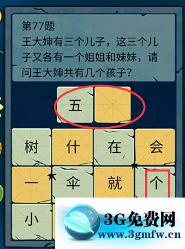 王大嬸有三個(gè)兒,這三個(gè)兒又各有一個(gè)姐和妹,請問王大嬸共有幾個(gè)孩是微信小程序《腦筋急轉(zhuǎn)彎大亂斗》游戲第77關(guān)的問題,很多玩家還知道答案是什么,下面小編為大家?guī)砦⑿拍X筋急轉(zhuǎn)彎大亂斗第77關(guān)攻略。