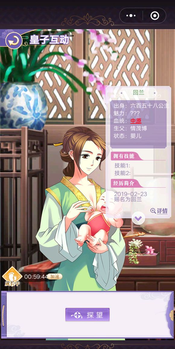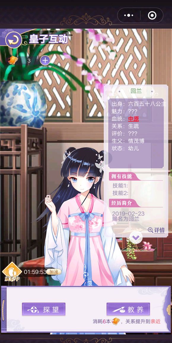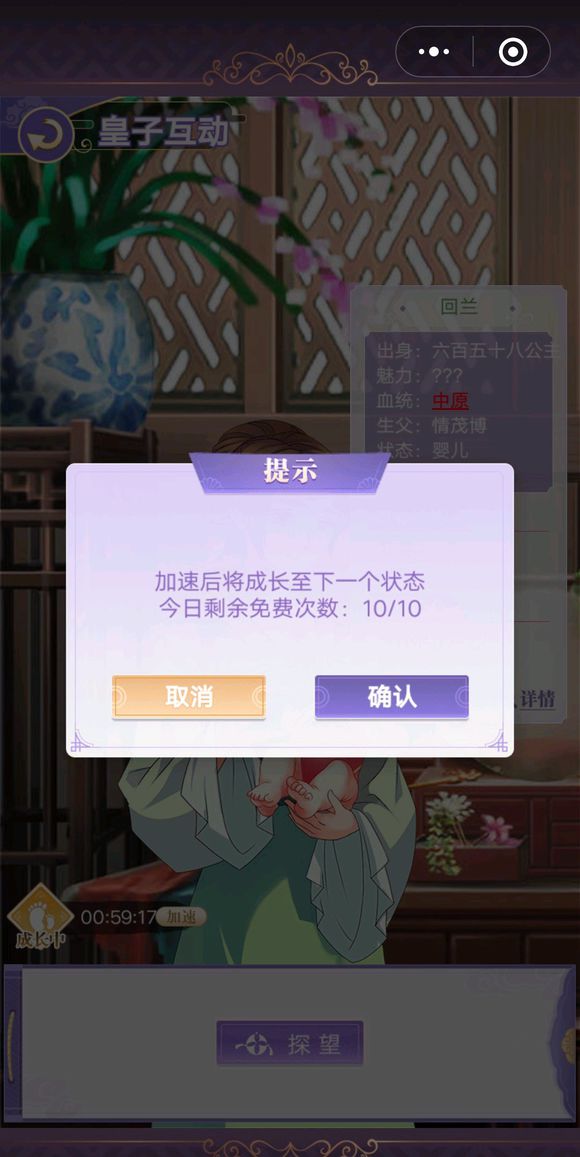 第一張圖是娃剛出生賜完名的嬰兒期,這個時候主要是看魅力和反應,接下來可以直接加速進入幼兒期,貴族等級不同加速的免費次數也不同,幼兒期才可以教養,也就是砸書回答問題