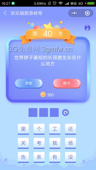 “世界脖子最短的長頸鹿生長在什么地方?”是微信小程序《歡樂腦筋急轉彎》第40關的問題,很多玩家不知道答案是什么?為了讓大家順利過關,小編為你帶來了微信歡樂腦筋急轉彎第40關答案。題目:世界脖子最短的長頸鹿生長在什么地方?