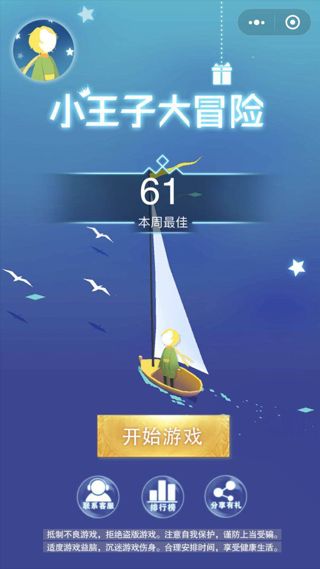 掃碼體驗小程序小程序類別:游戲開發者:個人小程序描述文藝清新的小王子冒險游戲,簡單操作享魔性樂趣